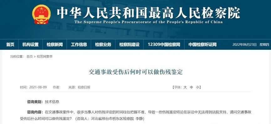 前言:在交通事故案件中,很多当事人对伤残评定的时间往往把握不准,导致一些伤残鉴定结论在诉讼中无法得到法院支持,那么,交通事故受伤后什么时间可以做伤残鉴定?本期推送内容为最高人民检察院官网对此问题的权威解答。